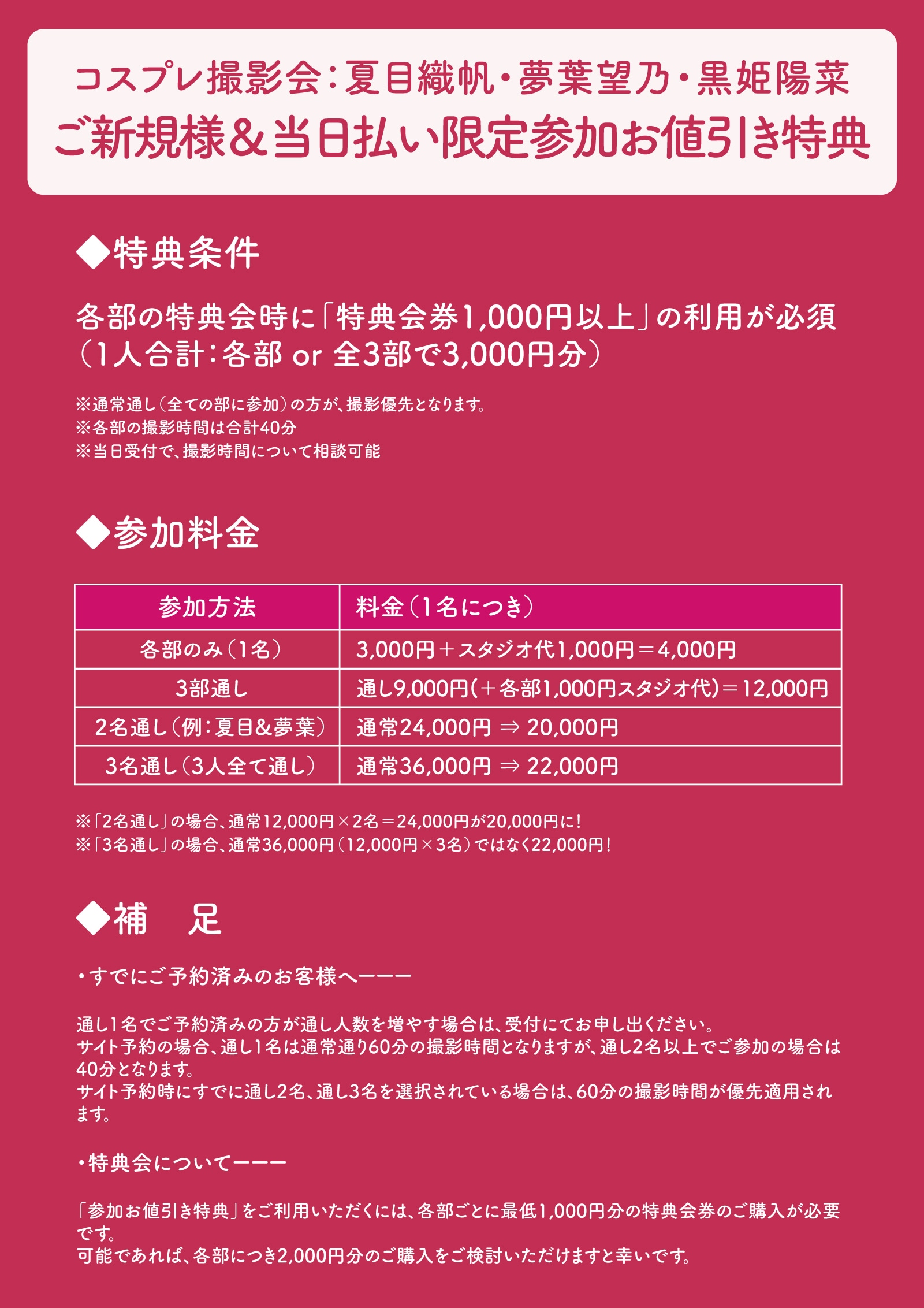 ※各部撮影会の時間が撮影時間となりセッション方式他の衣装はコスプレ、私服となります。